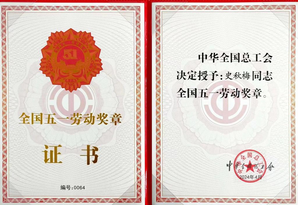 • 史秋梅教授荣获全国五一劳动奖章