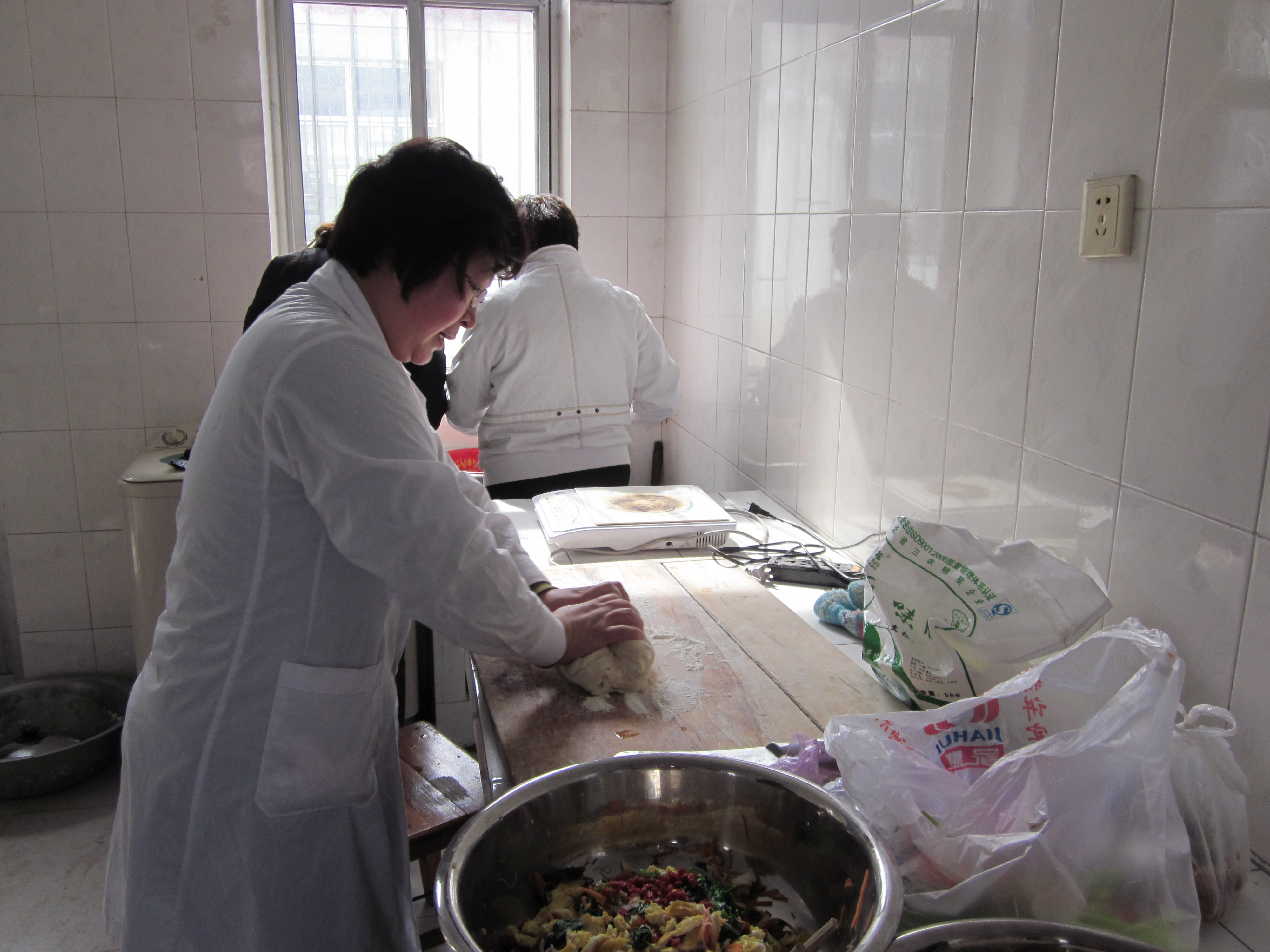 左右没课的女教师自发组成小组开始为中午的厨艺大赛兼品尝盛宴做准备,大家齐动手和面、洗菜、