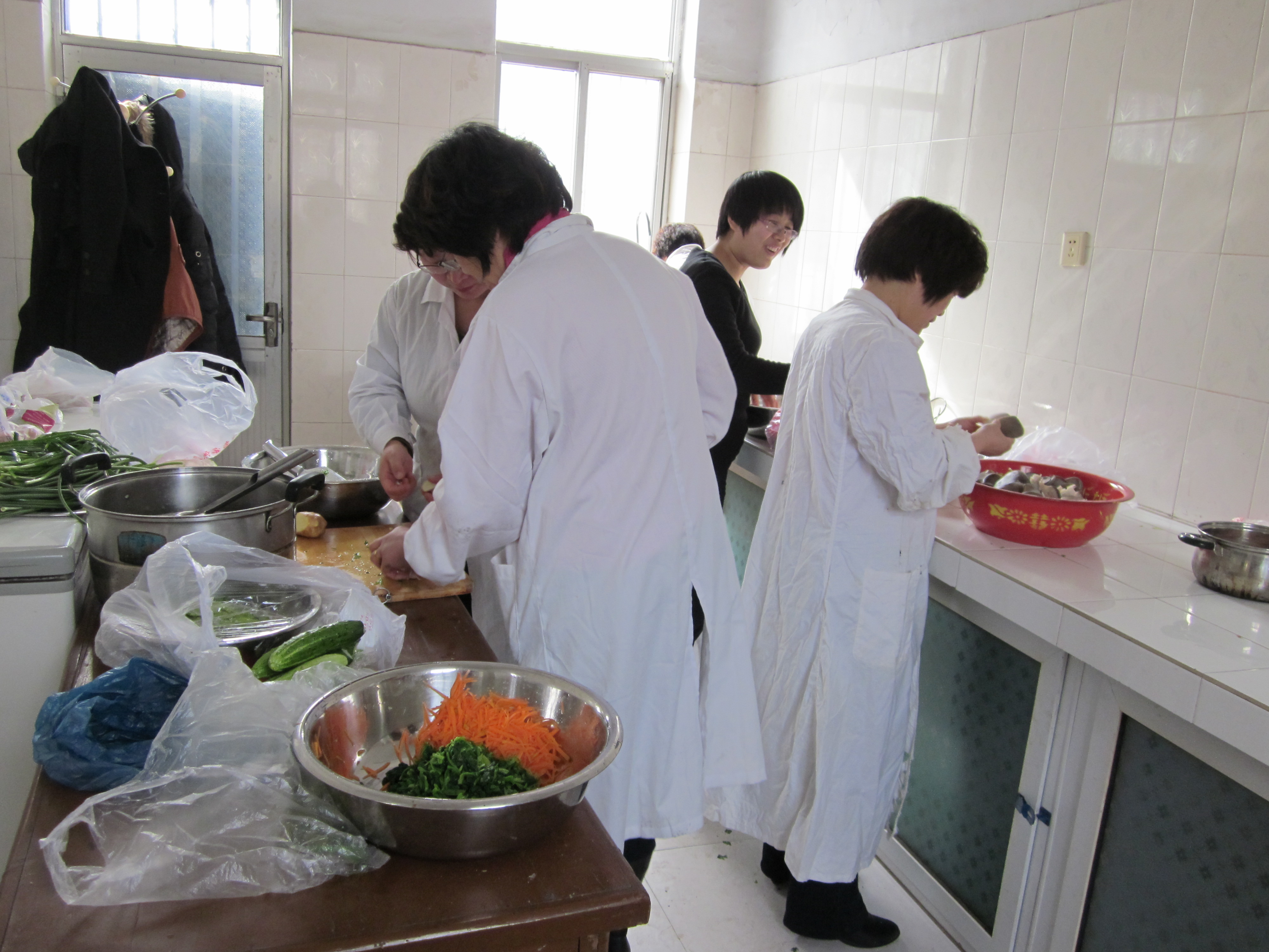 老师们精心准备菜肴的忙碌情景