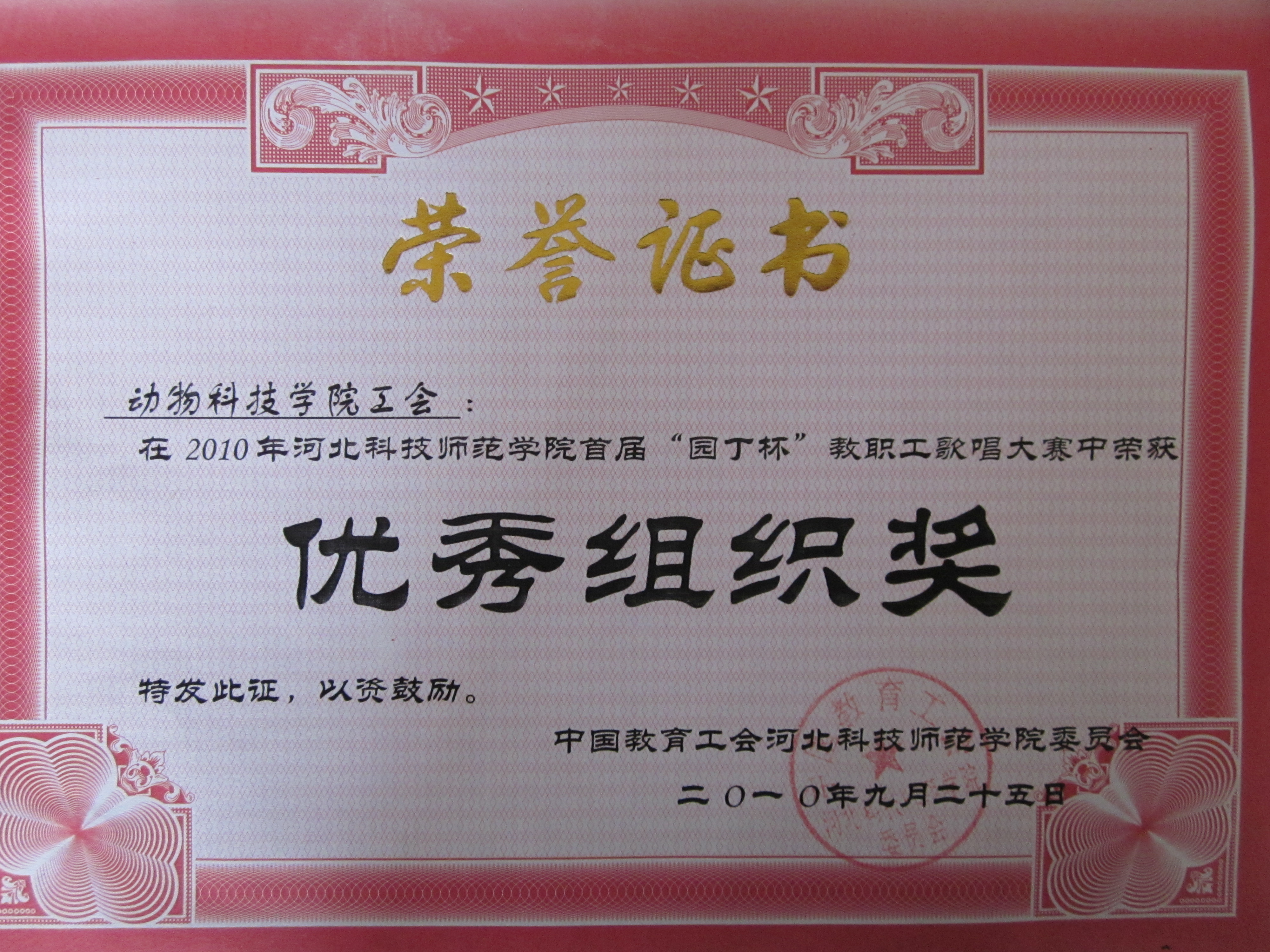 喜讯四:澳门网投官网工会在2010年校首届“园丁杯”教职工歌唱大赛中荣获“优秀组织奖”