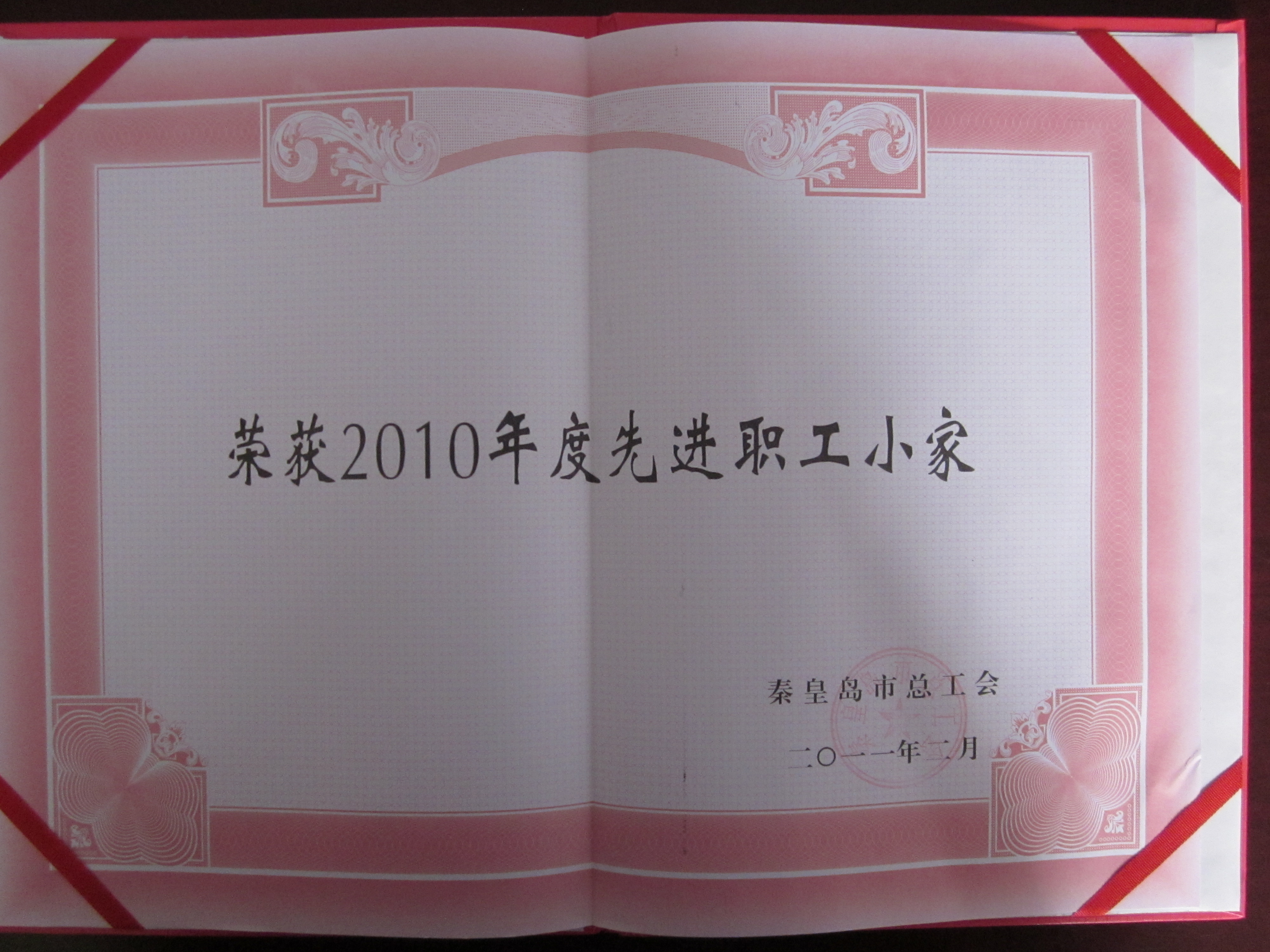喜讯一:澳门网投官网被秦皇岛市总工会授予“2010年度先进职工小家”荣誉称号