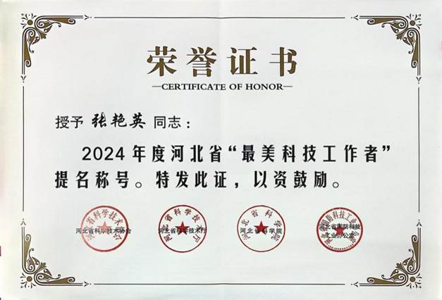 近日,澳门网投官网张艳英教授在2024年度的河北省“最美科技工作者”提名及评选活动中荣获“最美科技工作者”提名称号。该荣誉由省科技厅、省科学技术协会、省科学院、省国防科技工业合作办公室联合颁发,旨在弘扬科学家精神,激发科技工作者责任感。