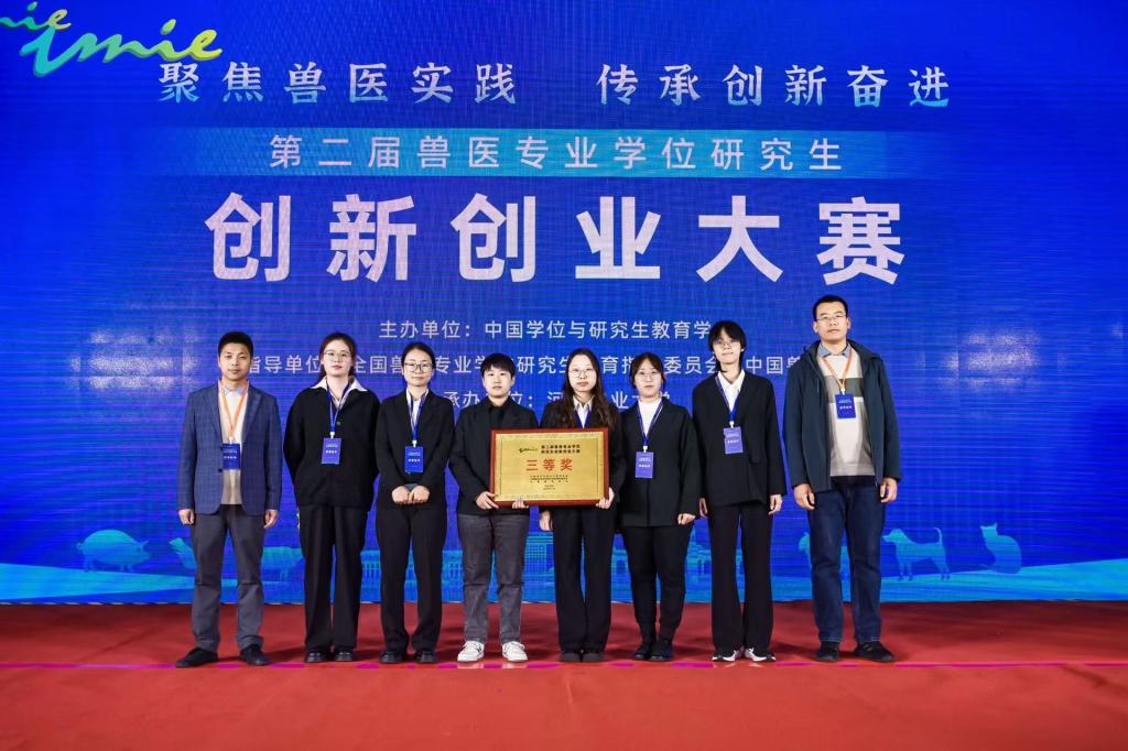 2024年11月4日至6日,第二届兽医专业学位研究生创新创业大赛在郑州举行。澳门网投官网兽医专业硕士研究生刘金金、郭紫薇、王晶毅、孙莹、赵秋旖、宋乘琦等6名同学组建的“控‘蓝’有道”团队,以“猪繁殖与呼吸综合征(PRRS)RNA疫苗研发”为题参加创新组比赛,并荣获大赛团体三等奖。方玉鹏博士和刘永波博士担任大赛的指导老师。