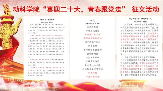 为深入学习贯彻4月25日习近平总书记在中国人民大学考察调研重要讲话精神,号召广大青年学生坚定不移听党话、跟党走。近日,动科学院党委面向全院青年学生开展“喜迎二十大,青春跟党走”主题征文活动,青年学子以丰富多彩的作品形式抒发对党和祖国无限深情的热爱。